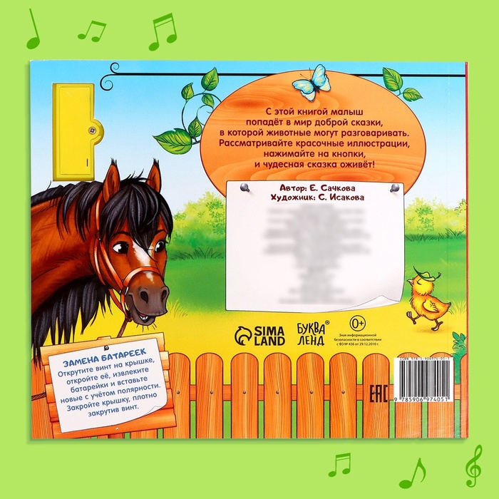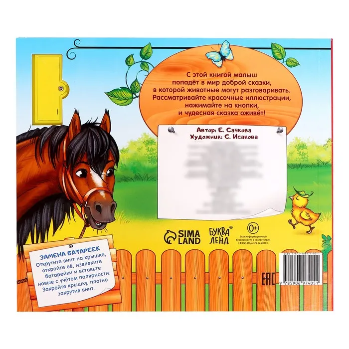 Страницы книги сделаны из плотного гладкого картона. Звуковой чип работает от батареек, входят в комплект.