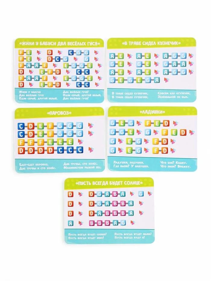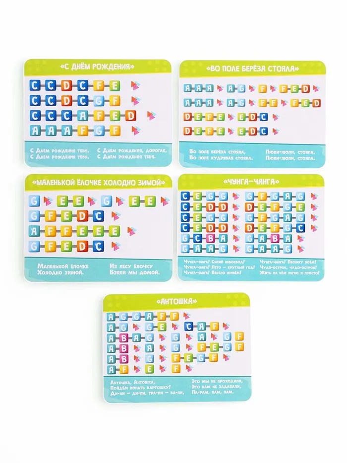 - В комплекте 10 карточек для обучения. Они помогут ребёнку освоить основы музыки, развить координацию и слух.