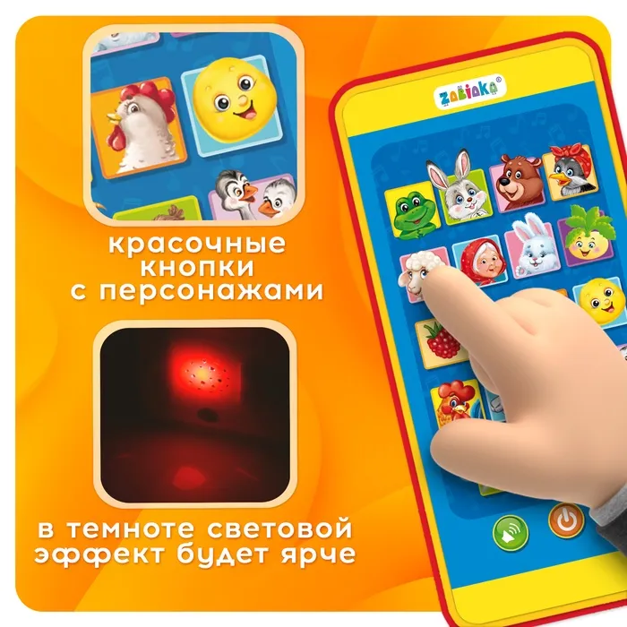 Включив телефончик, малыш сможет послушать весёлые песенки по мотивам известных русских народных сказок и потешек, познакомиться с героями. Все они перечислены на упаковке игрушки. Включайте чудо-проектор, смотрите картинки и развивайте воображение.