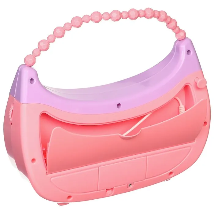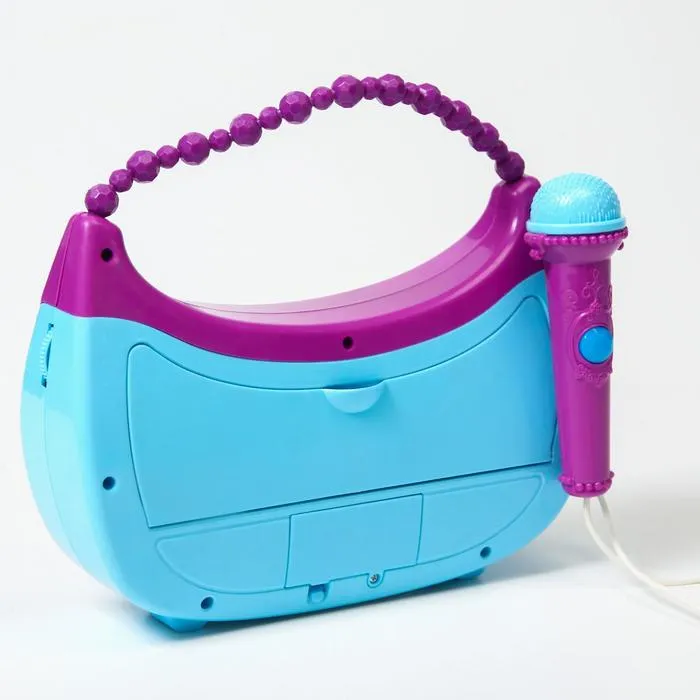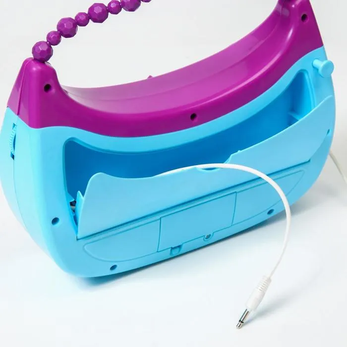 - Микрофон и колонка в одной сумочке. Подключается к телефону, чтобы петь треки из «Холодного сердца» или другие хиты. Сумочка мерцает разноцветными огнями — как волшебный дворец Эльзы.