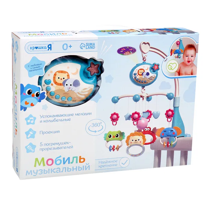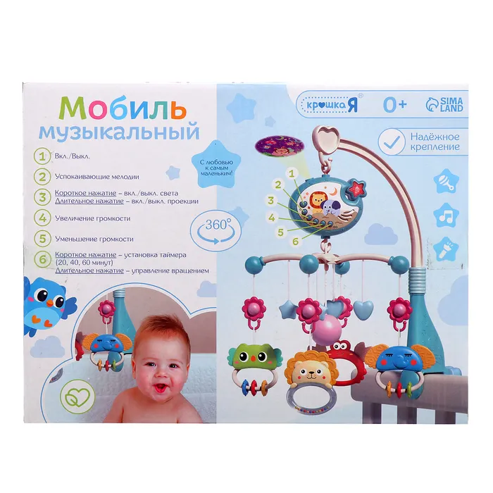 Музыкальный мобиль подарит вашему крохе сладкие сны и успокоит, когда ему станет грустно. Игрушка воспроизводит приятные мелодии и показывает проекцию с милой картинкой.