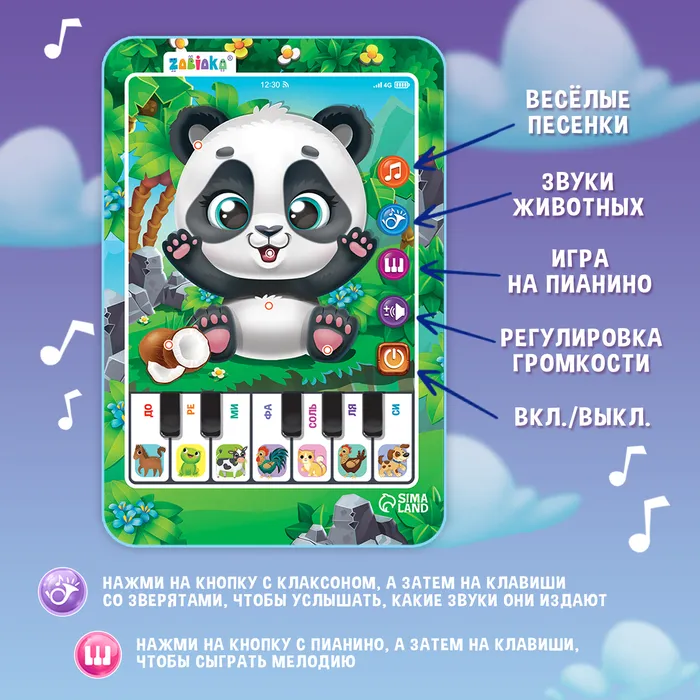 • Четыре режима игры: песенки, ноты, фразы и звуки животных.