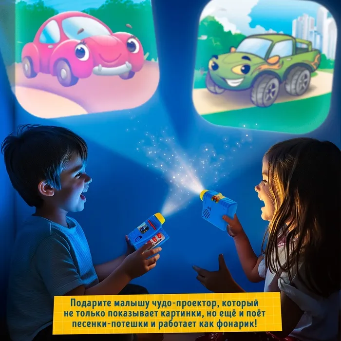 Яркие картинки поднимут настроение и надолго привлекут внимание малыша. Проектор не только показывает изображения, но ещё и воспроизводит весёлые песенки и звуки машин.