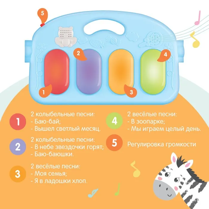 Нажимая на яркие клавиши, малыш будет слушать красивые мелодии и детские песенки, а также развивать музыкальный слух, чувство ритма, мелкую моторику и умение распознавать звуки.