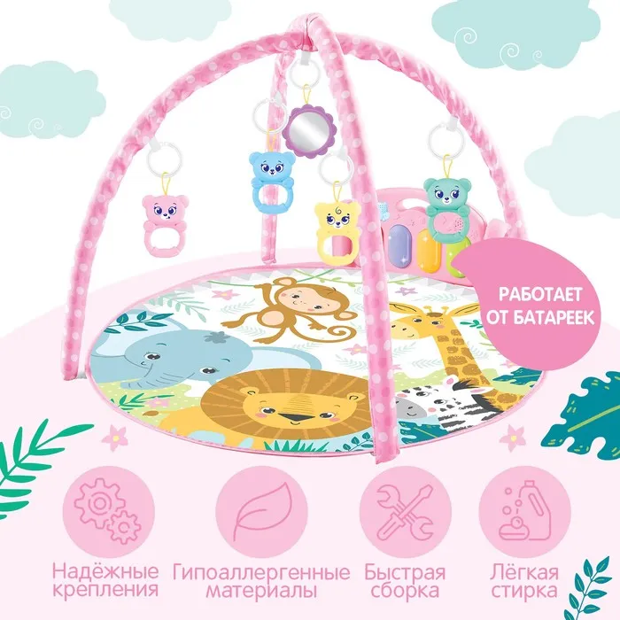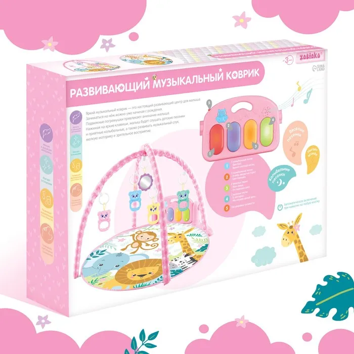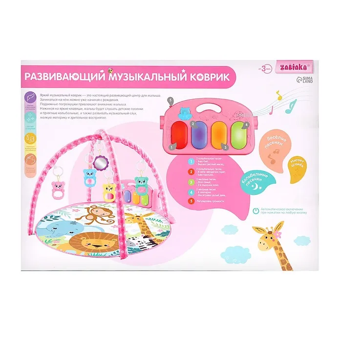 Яркий музыкальный коврик — это настоящий развивающий центр для малыша. Заниматься на нём можно уже начиная с рождения. С таким ковриком кроха быстрее научится держать головку и управлять телом, фокусировать взгляд на движущемся предмете и находить источник звука, а ещё потренирует тактильные навыки и мелкую моторику.
