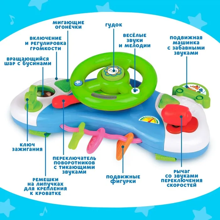 Музыкальный руль-подвеска «Весело рулим!» — яркая и увлекательная игрушка, которая надолго увлечёт вашего ребёнка, пока вы занимаетесь важными делами. Прикрепите руль в кроватку малыша и не беспокойтесь о его безопасности.