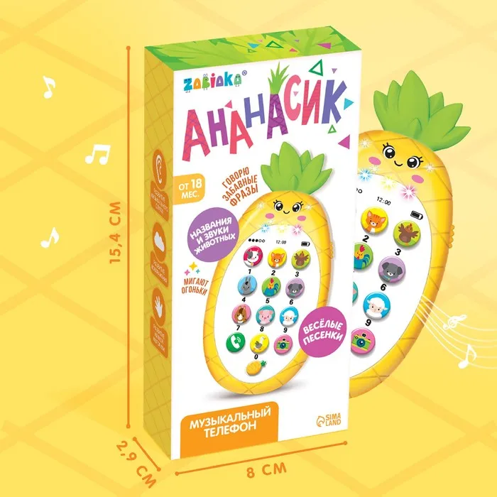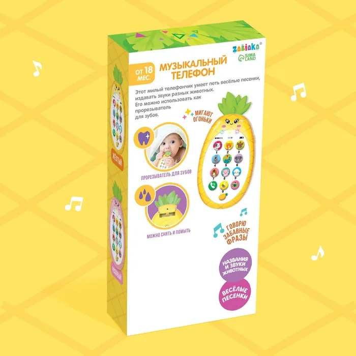Музыкальный телефон детский «Ананасик», свет, звук, цвет жёлтый — Характеристики