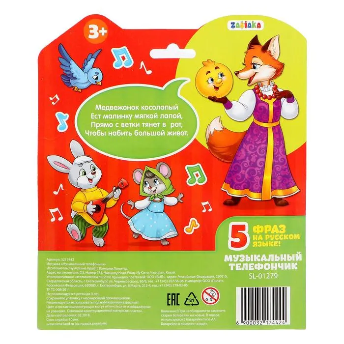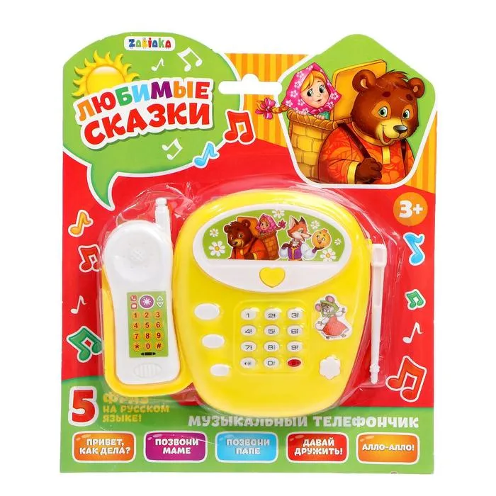 Телефон создан для сюжетных игр. Он помогает развивать моторику и слух у деток. Дизайн игрушки не оставит малышей равнодушными, ведь он выполнен с картинками милых зверят.