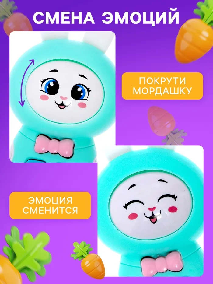 - Можно крутить мордочку зайки, чтобы менять эмоции (открытые и закрытые глазки).