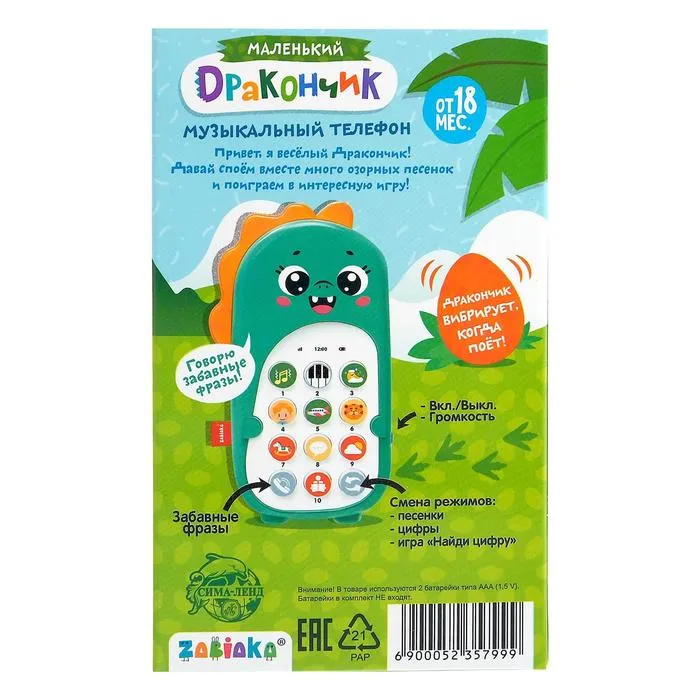 Музыкальный телефон «Маленький дракончик», звук, цвет зелёный — Характеристики