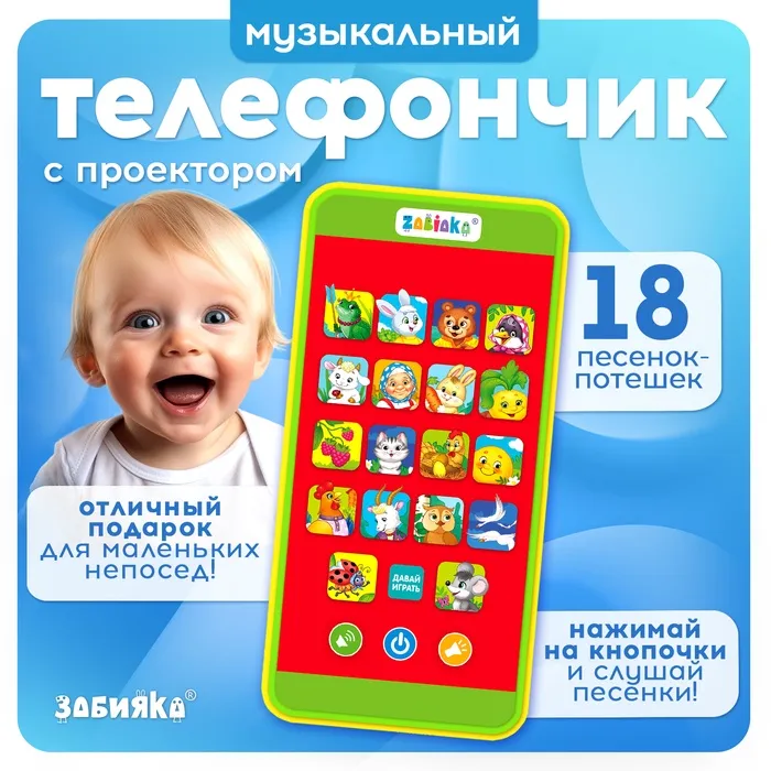 Нажимайте на кнопочки, слушайте забавную мелодию, звуки телефона и весело играйте вместе с малышом.