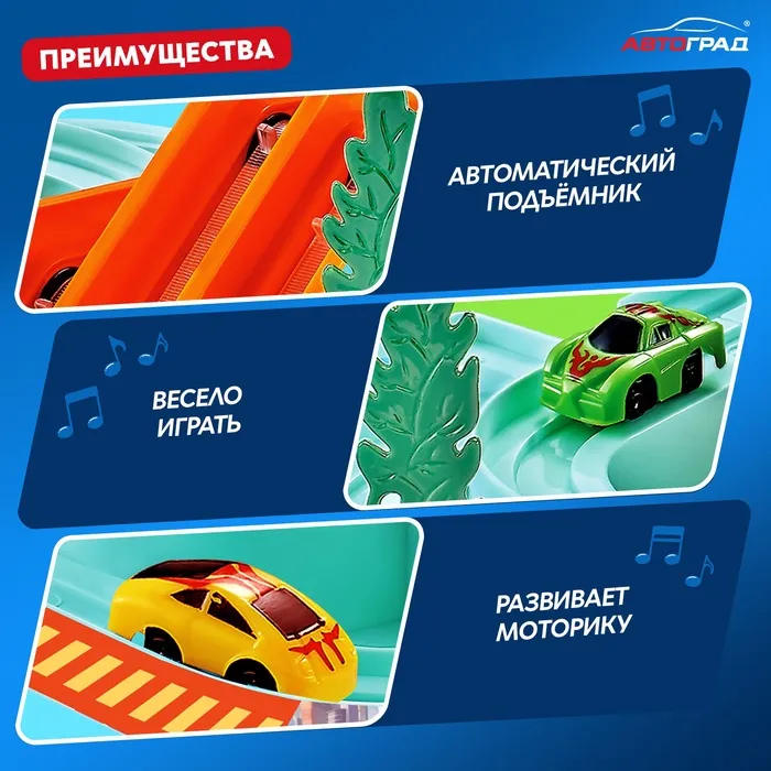 С игрушкой «Музыкальный трек» ребёнок устроит захватывающие заезды и станет абсолютным чемпионом гонки! Яркий дизайн и проработанные элементы сделают игру реалистичной, а подвижные элементы добавят динамичности.