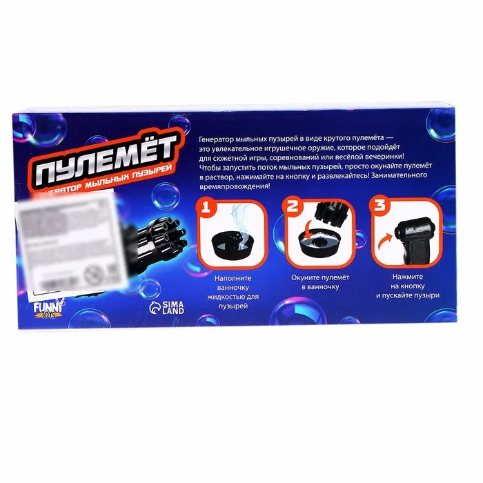 Генератор мыльных пузырей выполнен в виде пулемёта. Изделие подойдёт для сюжетной игры в войнушку или весёлой вечеринки.