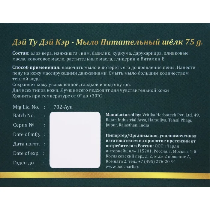 Мыло аюрведическое натуральное Дэй Ту Дэй Кэр питательный шелк, 75 г — Характеристики
