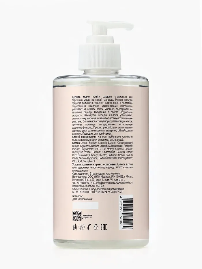 Средство не содержит красителей и животных жиров, обладает гипоаллергенной отдушкой и имеет нейтральный pH — всё для того, чтобы сохранить здоровье и комфорт малыша. Удобная крышка-дозатор обеспечивает точный и экономичный расход.