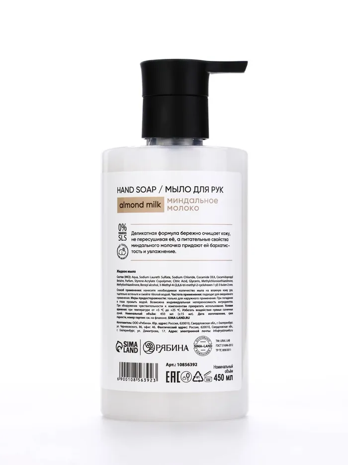Мыло для рук жидкое, 450 мл, аромат миндальное молоко, ULAB — Характеристики