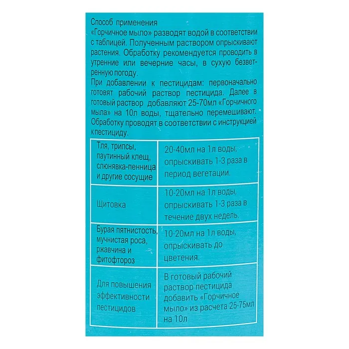 При добавлении к пестицидам: приготовьте рабочий раствор пестицида, влейте в него 25–70 мл горчичного мыла на 10 л вещества. Тщательно перемешайте. Проводите обработку в соответствии с инструкцией к пестициду.