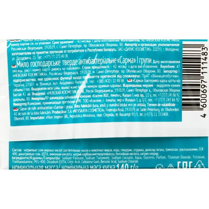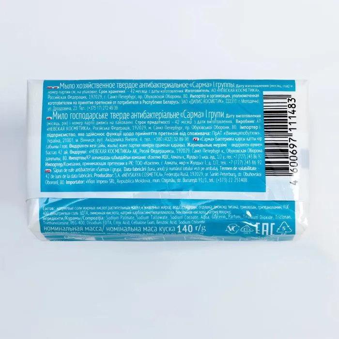 Мыло хозяйственное Sarma 3 в 1 «Антибактериальное», 140 г — Характеристики