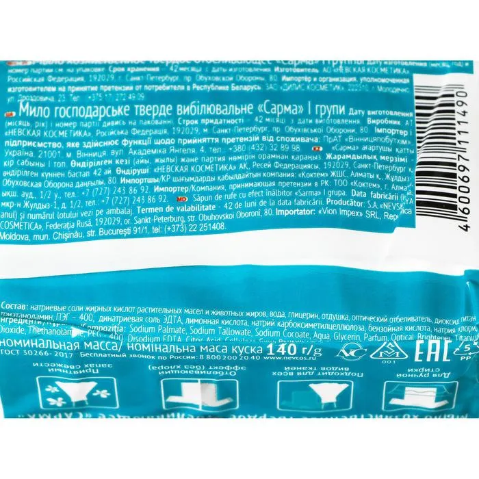 Мыло хозяйственное Sarma «Отбеливающее», 140 г — Характеристики
