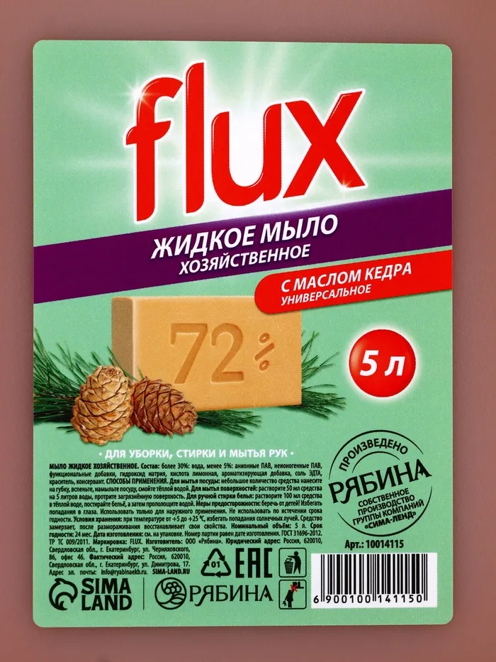 Мыло хозяйственное, жидкое, 72%, «Масло кедра», 5 л, FLUX — Характеристики