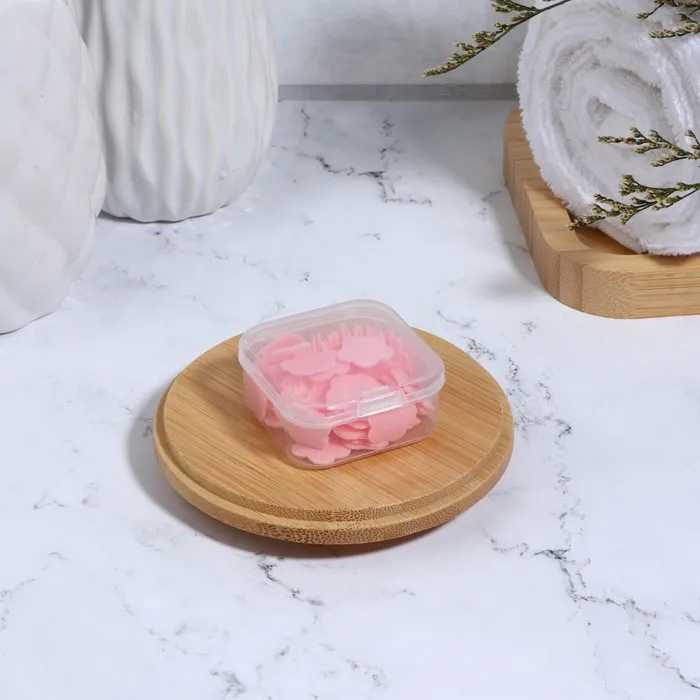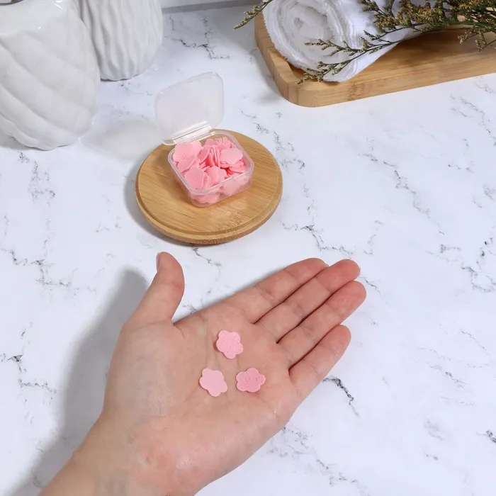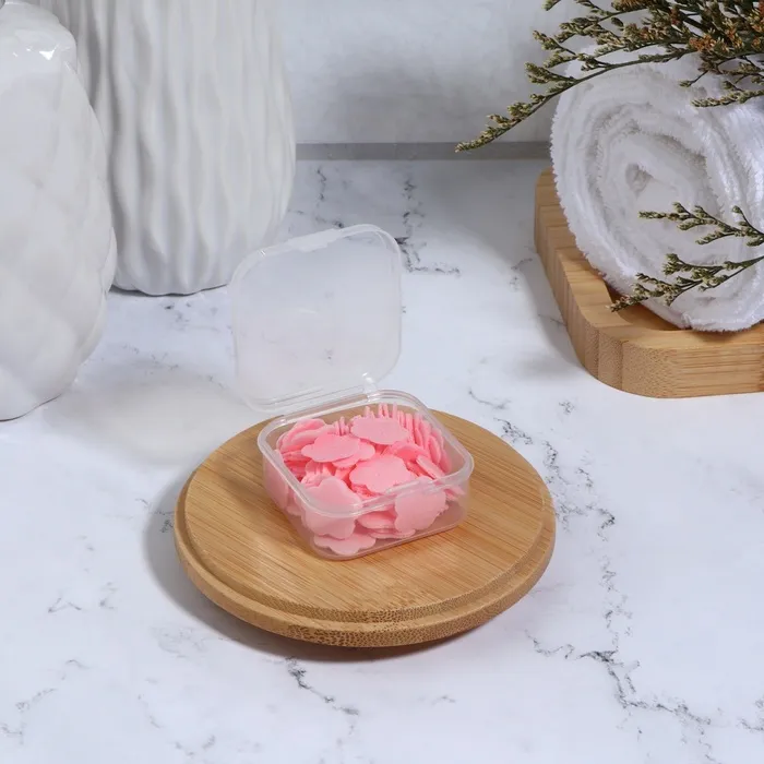 Мыло представляет собой тонкие мыльные листы, образующее при контакте с водой пышную пену. Мыло в пластинках идеально для путешествий, в командировку, на прогулку, на природу, для школы и тренировок. Пластинки абсолютно гигиеничны, а мыльница не занимает много места в кармане или сумке. Достаньте сухими руками один лист, намочите лист мыла и потрите ладоши до образования пены, смойте водой.