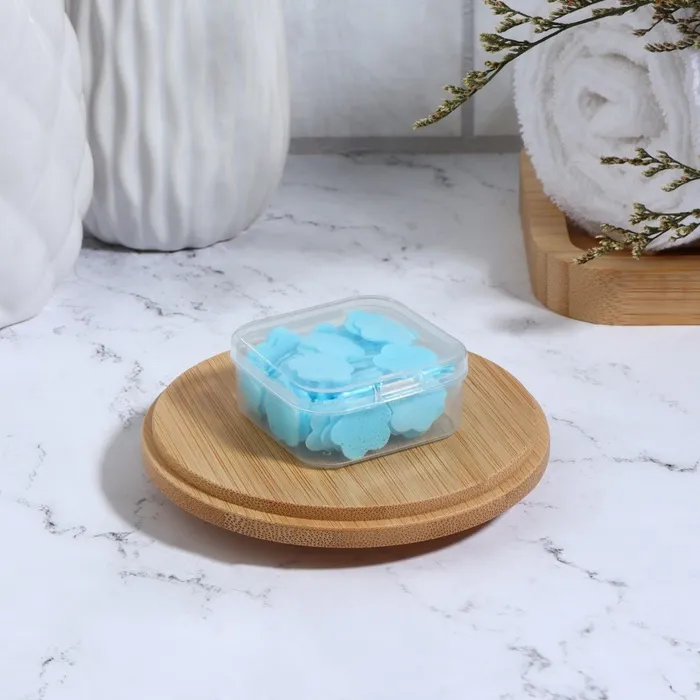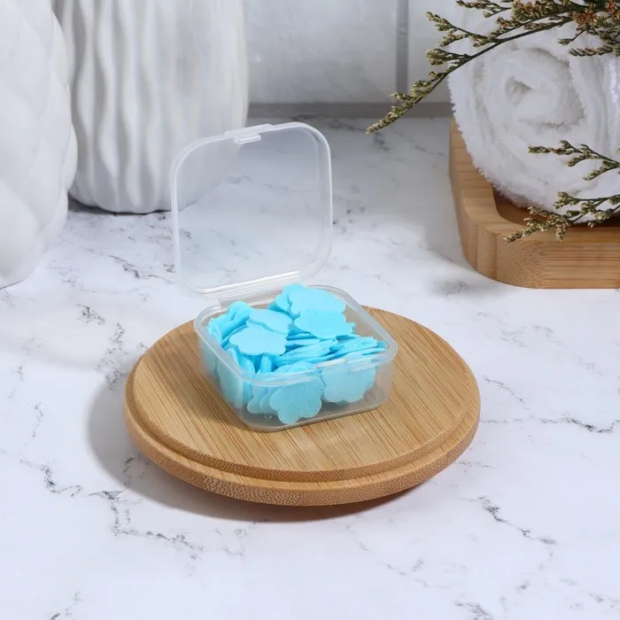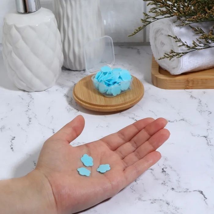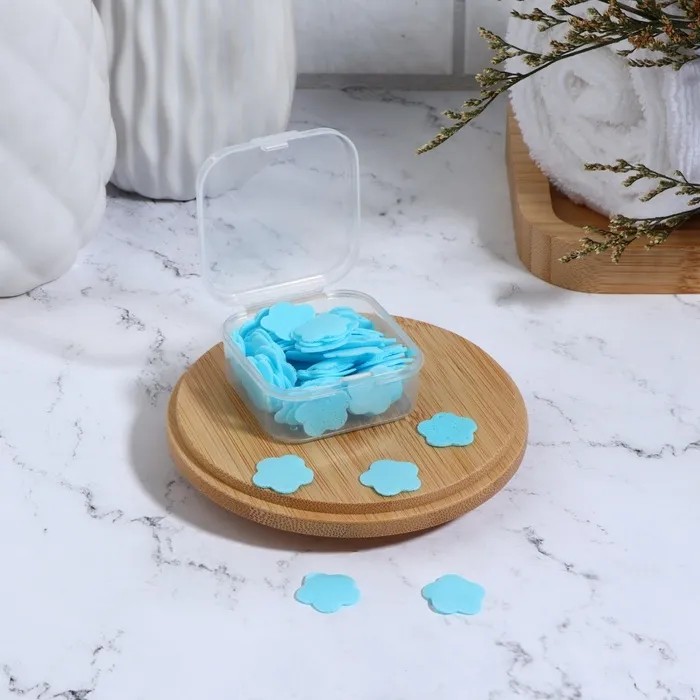 Мыло представляет собой тонкие мыльные листы, образующее при контакте с водой пышную пену. Мыло в пластинках идеально для путешествий, в командировку, на прогулку, на природу, для школы и тренировок. Пластинки абсолютно гигиеничны, а мыльница не занимает много места в кармане или сумке. Достаньте сухими руками один лист, намочите лист мыла и потрите ладоши до образования пены, смойте водой.