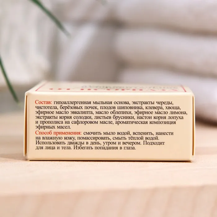 Состав: гипоаллергенная мыльная основа, экстракты череды, чистотела, берёзовых почек, плодов шиповника, клевера, хвоща, эфирное масло эвкалипта, масло облепихи, эфирное масло лимона, экстракт корня солодки, настой корня лопуха, листья брусники, настой прополиса.