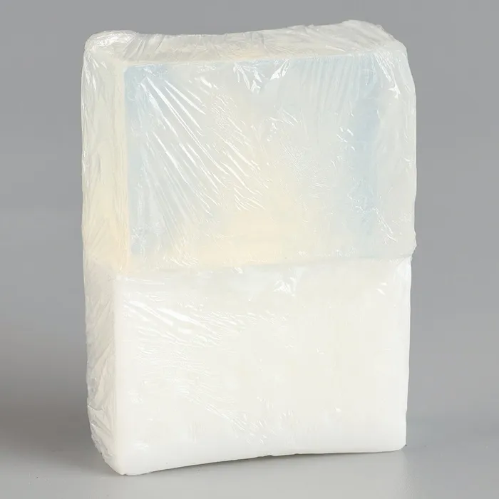 - Прозрачную мыльную основу нарезать кусочками и растопить в микроволновой печи на минимальной мощности.