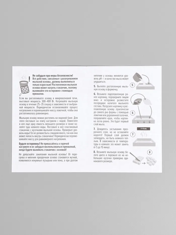 Набор рекомендован для детей старше 5 лет. Все действия, связанные с разогревом мыльной основы, должны выполняться только взрослыми!