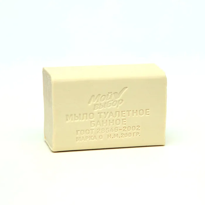 Мыло туалетное 200 гр. Банное "Мой выбор" в прозрачной обертке флоупак марки Ординарное не содержит парабенов и сульфатов, что делает его безопасным для использования даже на чувствительной коже. Оно не вызывает раздражения или сухости кожи, а наоборот - увлажняет ее и делает более здоровой.