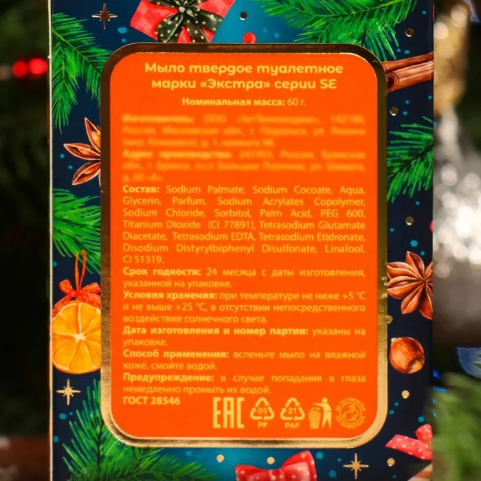 - Поздравление на упаковке: Наличие поздравления "С Новым Годом!" на упаковке делает это мыло идеальным выбором в качестве новогоднего подарка для близких, коллег или друзей.