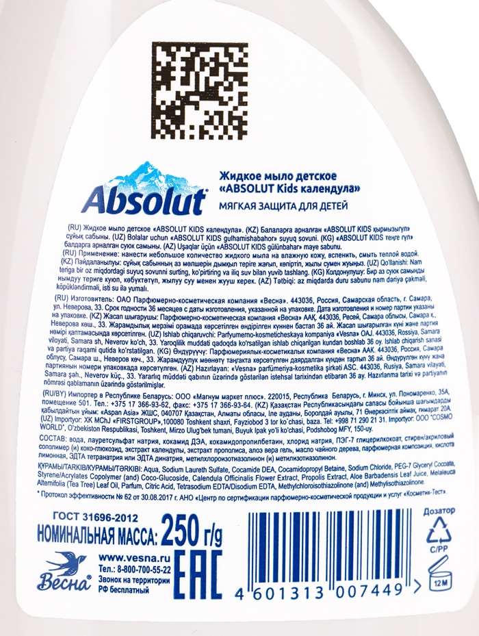 Мыло жидкое Абсолют Kids «Календула», 250 г обладает противовоспалительным и смягчающим действием, сохраняет кожу ребёнка нежной и здоровой. Гиппоаллергенно. Не содержит красителей.