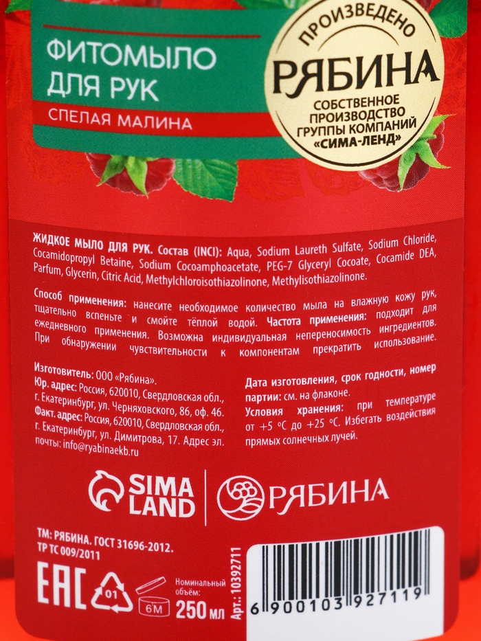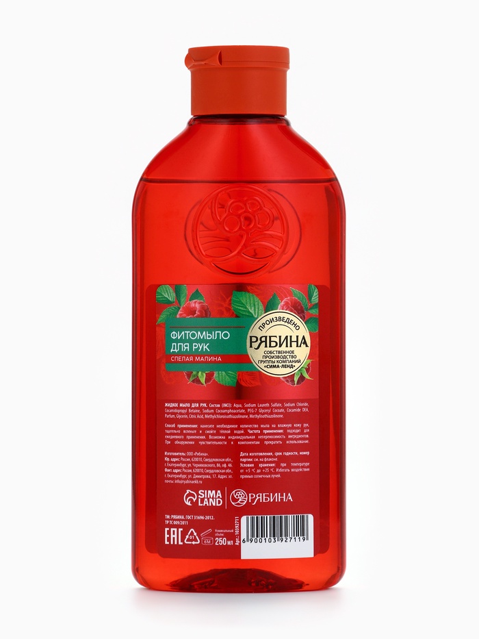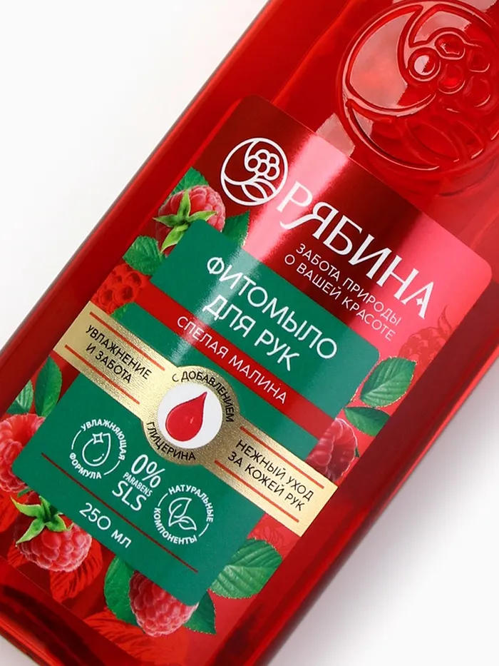 Мыло жидкое для рук, увлажнение и забота, аромат малины, 250 мл, Рябина — Характеристики
