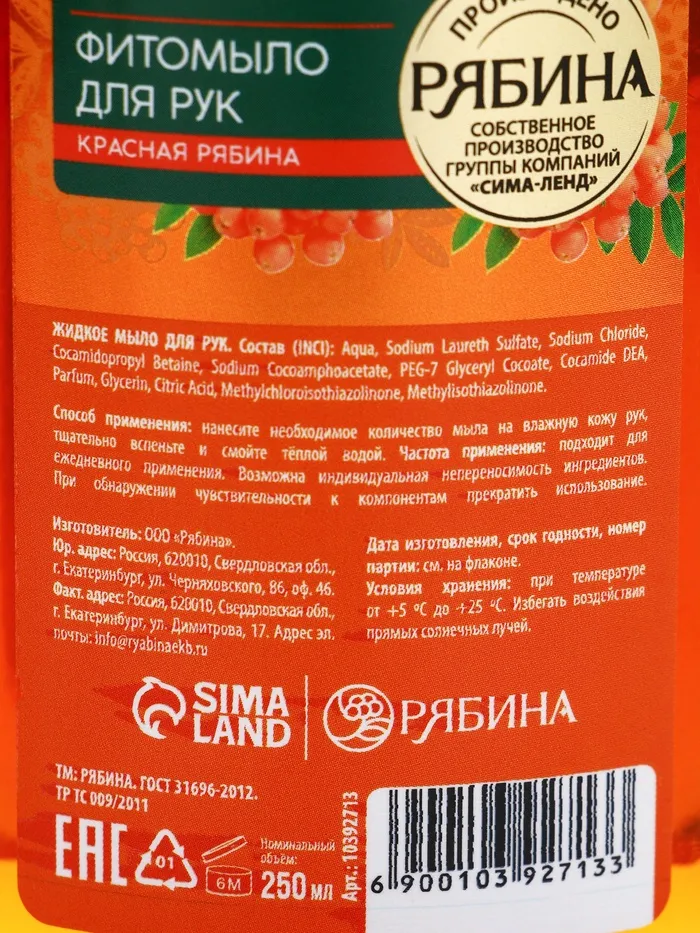 Мыло жидкое для рук, увлажнение и забота, аромат рябины, 250 мл, Рябина — Характеристики