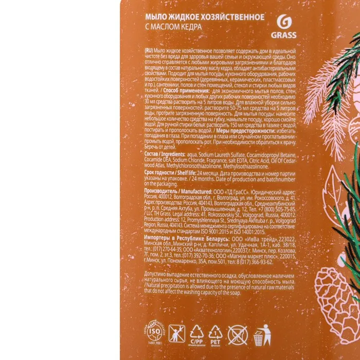 Мыло жидкое хозяйственное позволяет содержать дом в идеальной чистоте без вреда для здоровья вашей семьи и окружающей среде. Оно отлично справляется с любыми жировыми загрязнениями и благодаря входящему в состав натуральному маслу кедра, обладает антибактериальными свойствами. Подходит для мытья посуды, кухонного оборудования, рабочих водостойких поверхностей (деревянных, керамических, пластмассовых и пр.), сантехники, полов и стен помещений, стекол и стирки любых видов тканей.