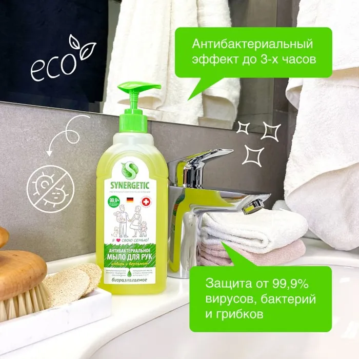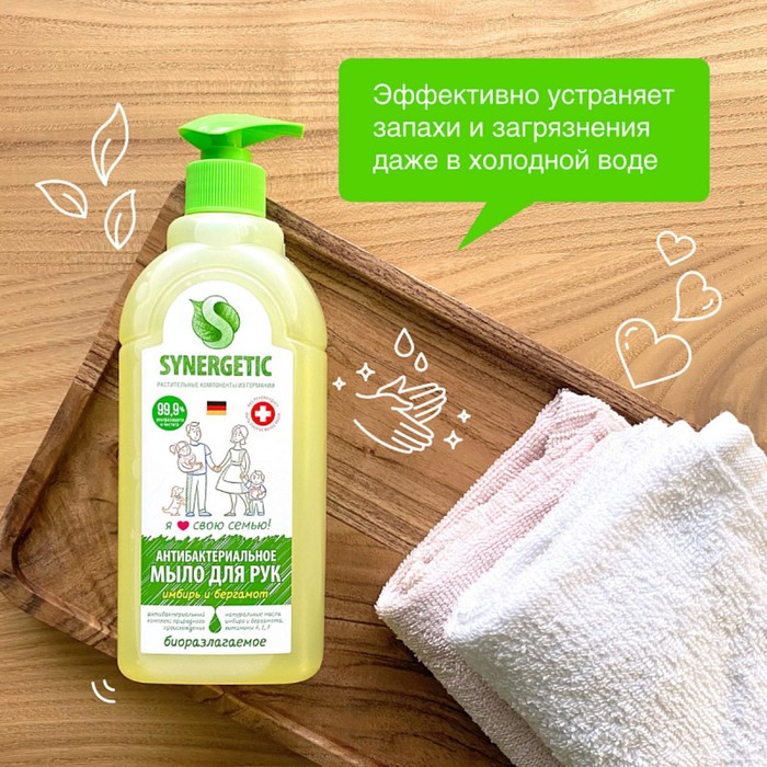 Мыло жидкое Synergetic «Имбирь и бергамот», гипоаллергенное, антибактериальное, 500 мл — Характеристики