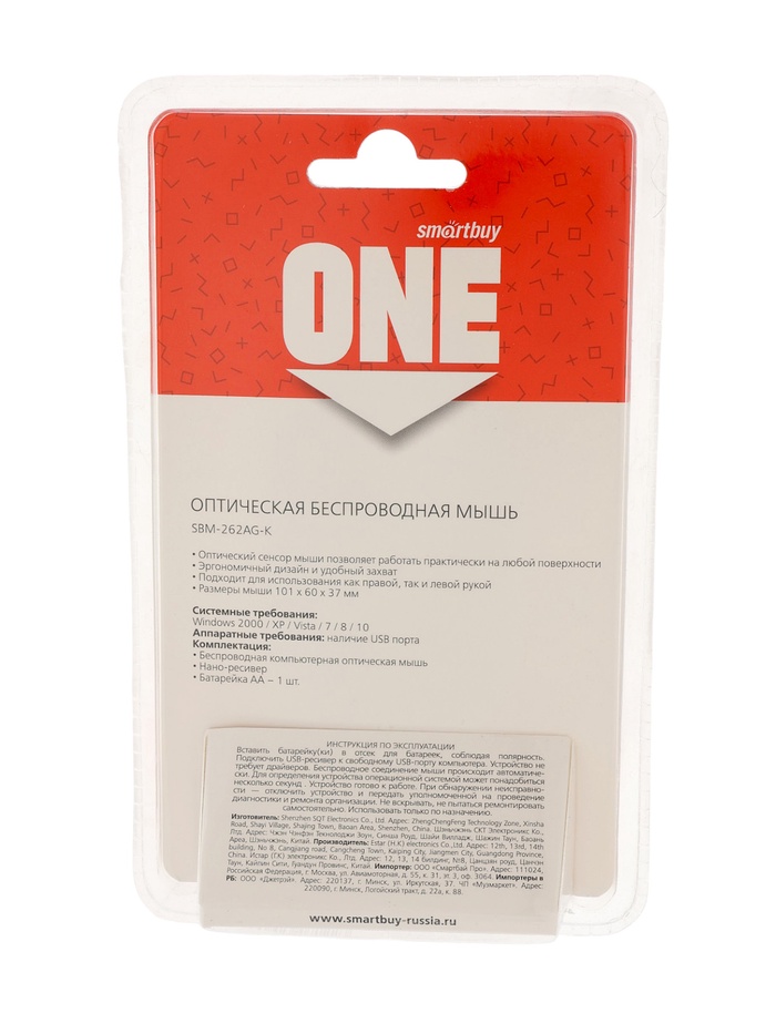 Мышь Smartbuy ONE 262AG, беспроводная, оптическая, 4 кнопки, 1600 dpi, USB, 1хАА, чёрная — Характеристики