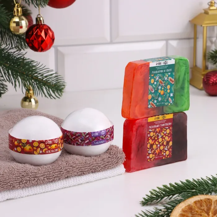Погрузитесь в мир роскошного ухода с набором для ванны, включающим 2 ароматные бомбочки и 2 мыла.