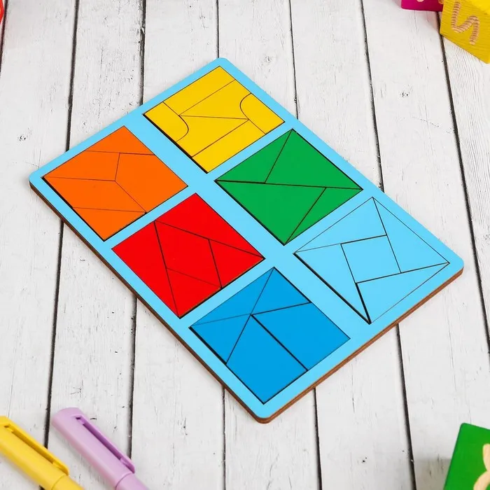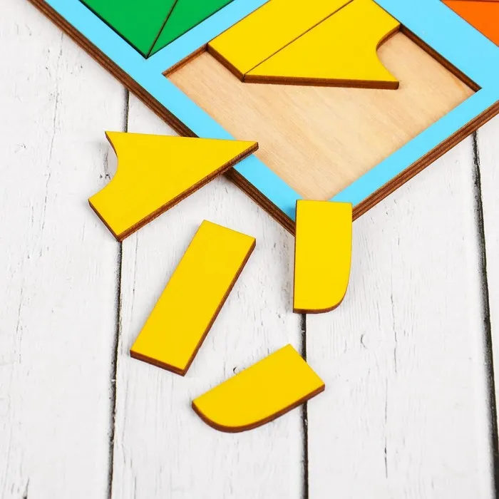 Задача малыша — собрать 12 квадратов из цветных элементов: треугольников, прямоугольников и других фигур. В процессе ребёнок знакомится с новыми формами и цветами, учится соотносить части и целое. Постепенное усложнение заданий позволяет малышу самостоятельно осваивать материал и не прибегать к помощи родителей.