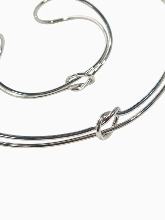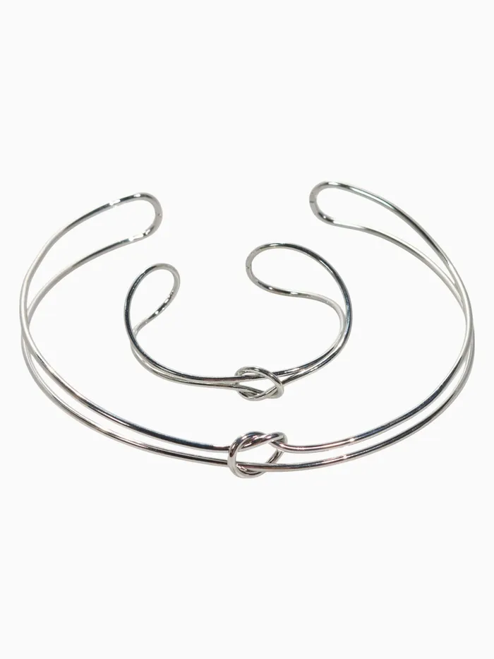 Серебристый комплект из чокера и браслета с изящным узлом «Обруч» — это сочетание современного минимализма и утончённой элегантности, которое легко впишется в любой гардероб. Лаконичный дизайн без вставок подчёркивает чистоту линий и делает аксессуары универсальными для повседневного и вечернего образа.