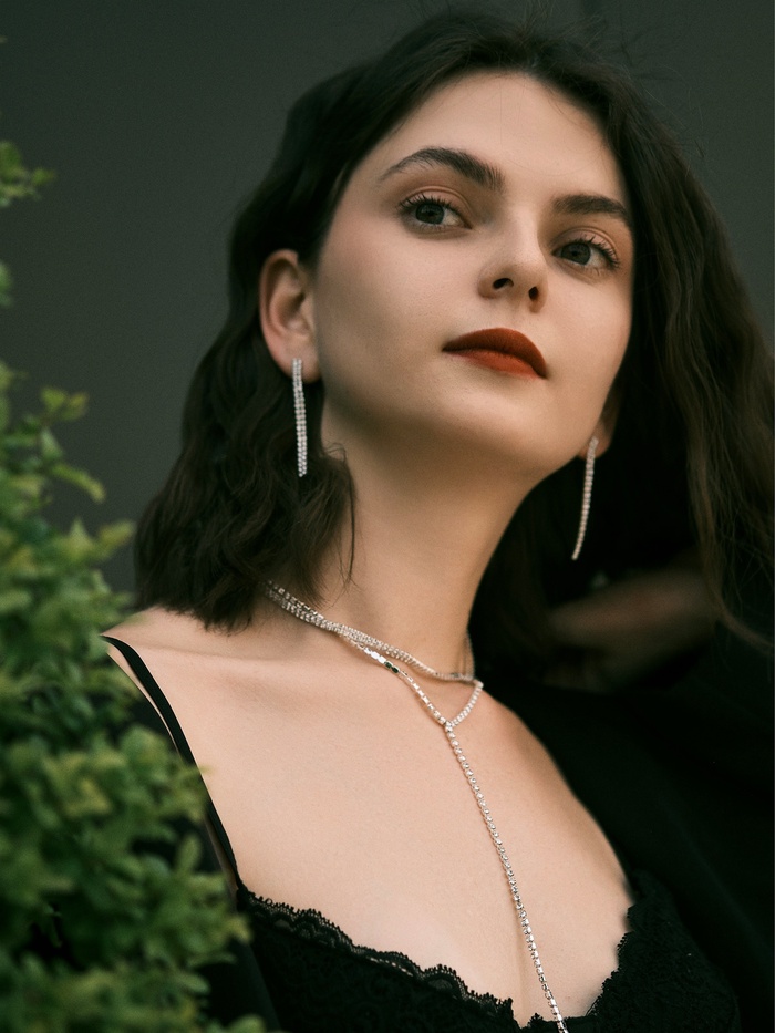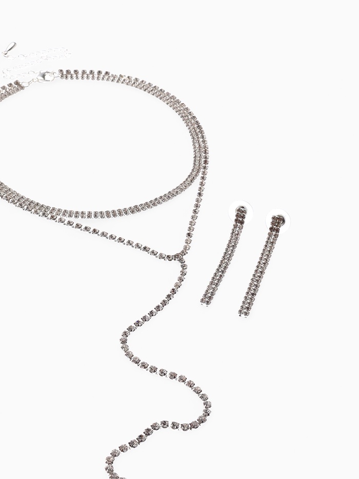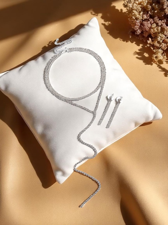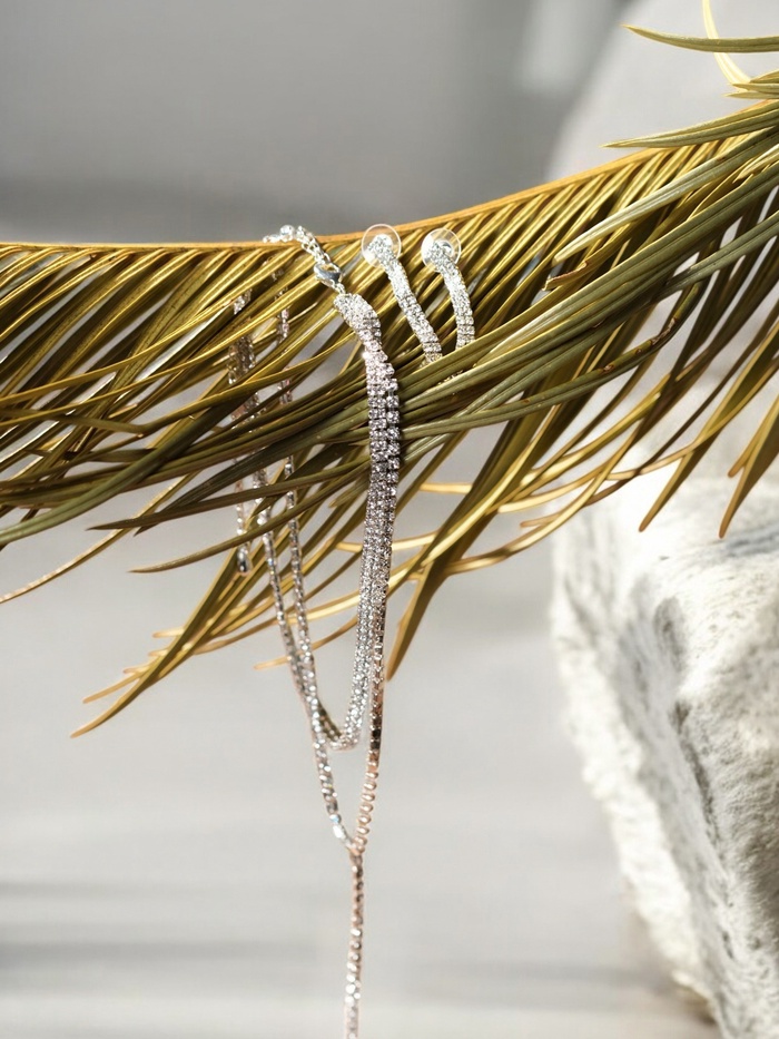 - Современный стиль: минималистичный дизайн с акцентом на блеск стразов делает комплект универсальным для разных событий — от деловых встреч до вечерних выходов.