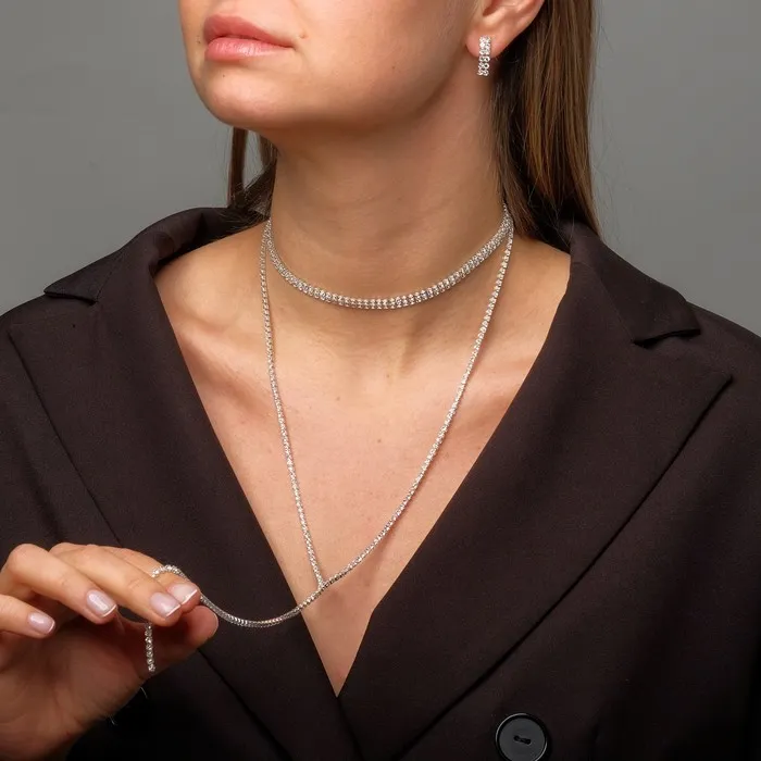 Бижутерный набор из двух предметов «Лёд» — это изысканное сочетание серёжек и чокера, которое идеально подходит для создания эффектного образа. Если носить украшения вместе, они станут прекрасным дополнением к вечернему или праздничному наряду, добавив нотку элегантности и блеска. Сережки из набора также можно носить отдельно, что делает их универсальным аксессуаром для любого случая, даже без повода. Стильный чокер добавит современной изюминки в Ваш образ.