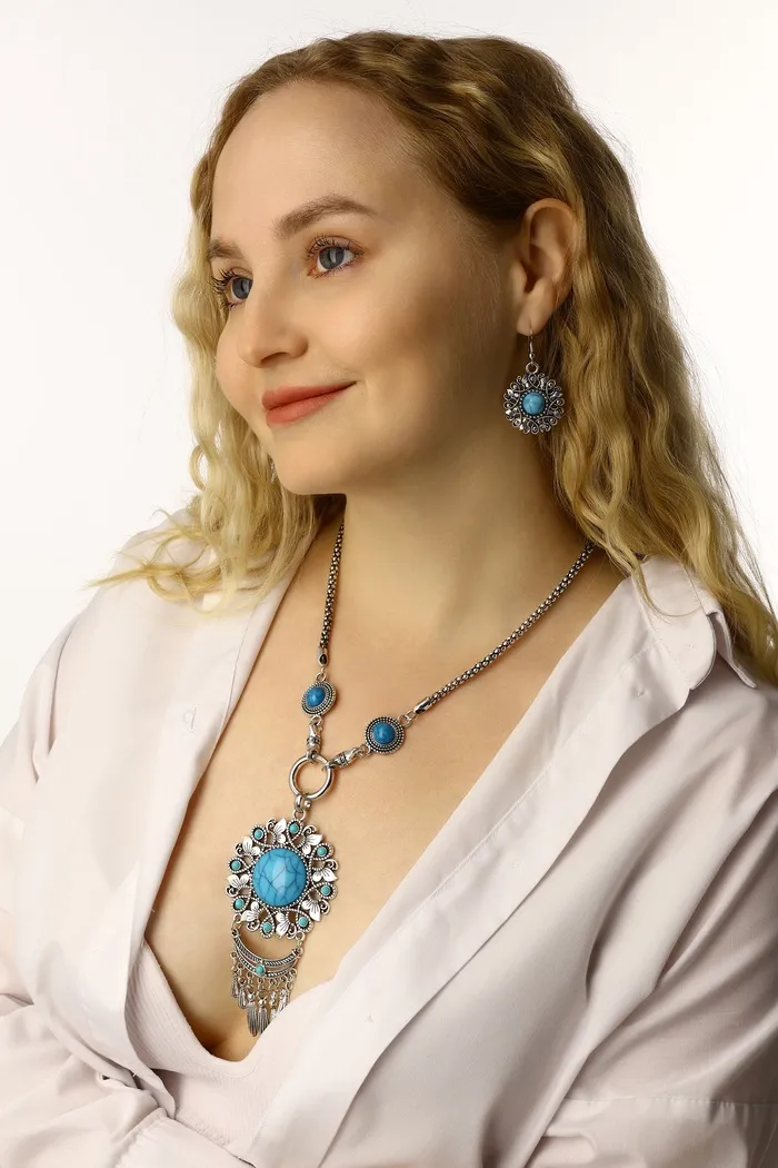 Бижутерный набор из двух предметов: серьги и колье — идеальное дополнение к вашему образу! Этот стильный аксессуар можно носить как вместе, так и по отдельности. Благодаря высококачественным материалам и профессиональному исполнению, наш набор станет изюминкой вашего гардероба. Добавьте его в свою коллекцию украшений и наслаждайтесь восхищёнными взглядами окружающих!