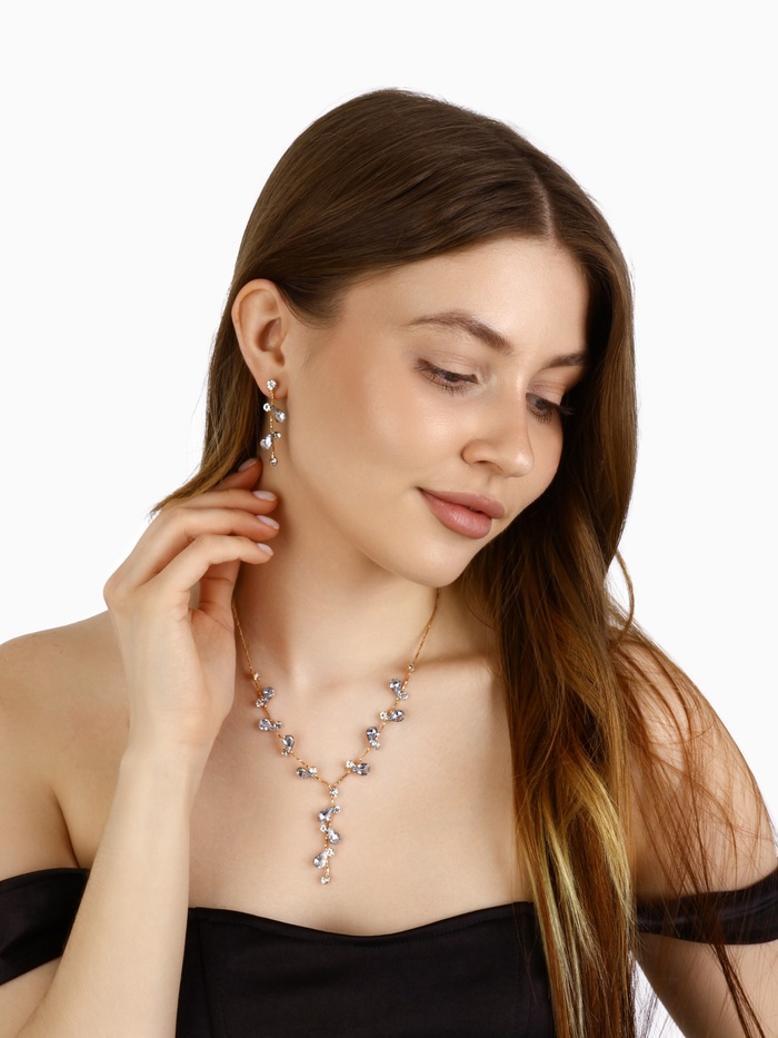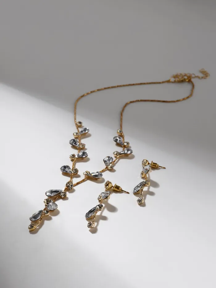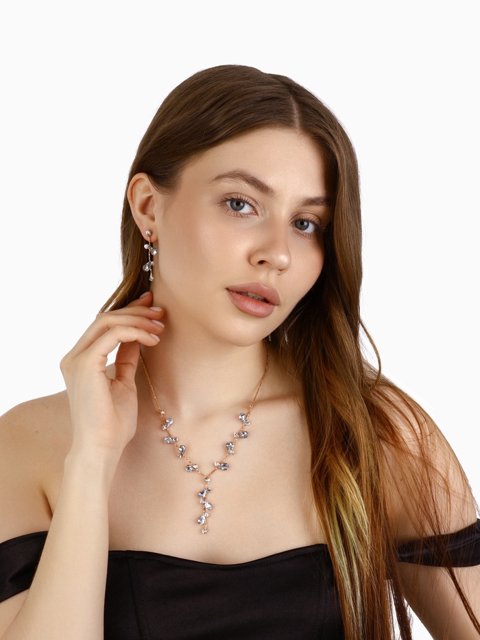 Набор из двух предметов: серьги и колье со стразами — это элегантный аксессуар с уникальным дизайном, который добавит сияния вашему образу. Этот комплект идеально подойдет для любого мероприятия, подчеркивая утонченность и стиль. Серьги и колье можно носить вместе или раздельно, дополняя образы для любого случая.