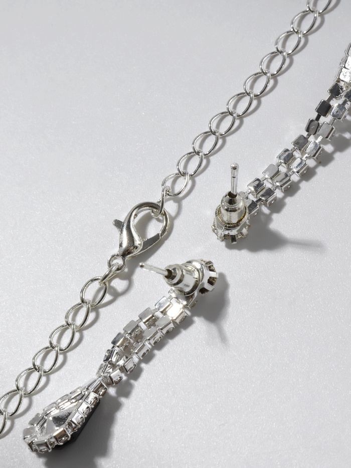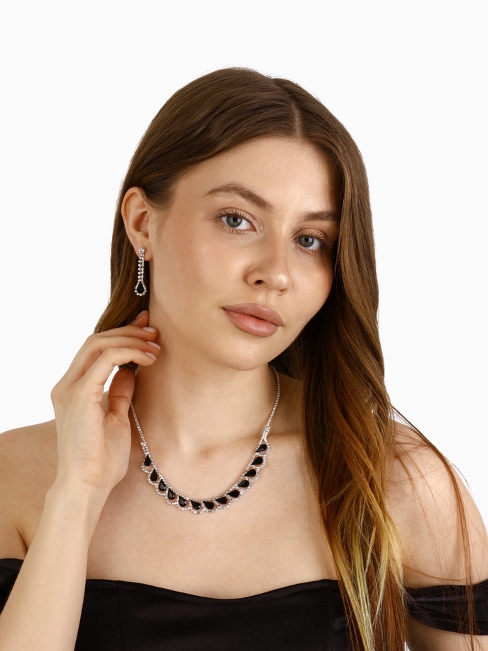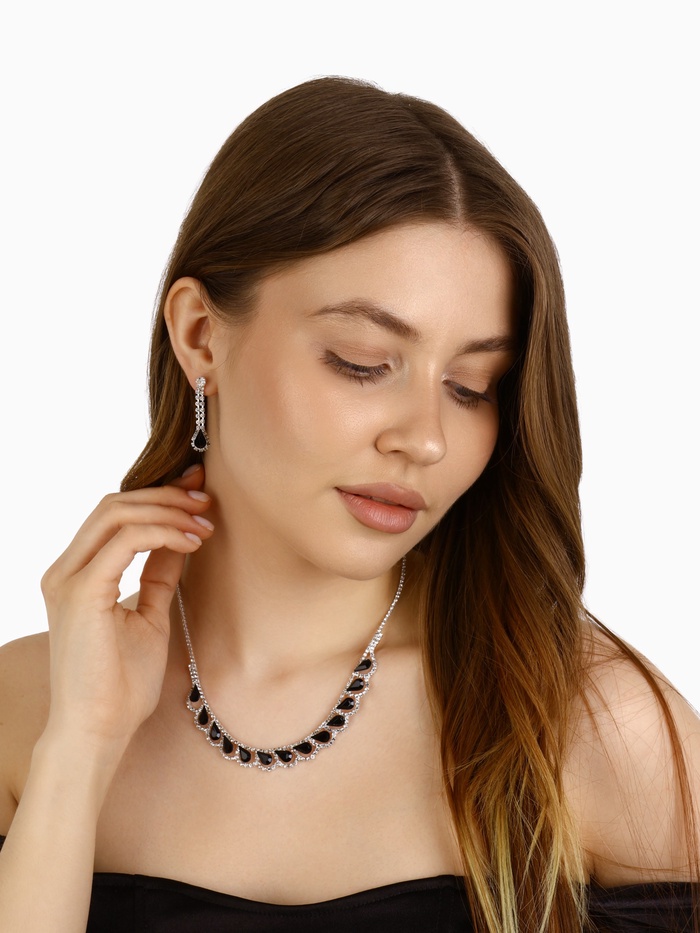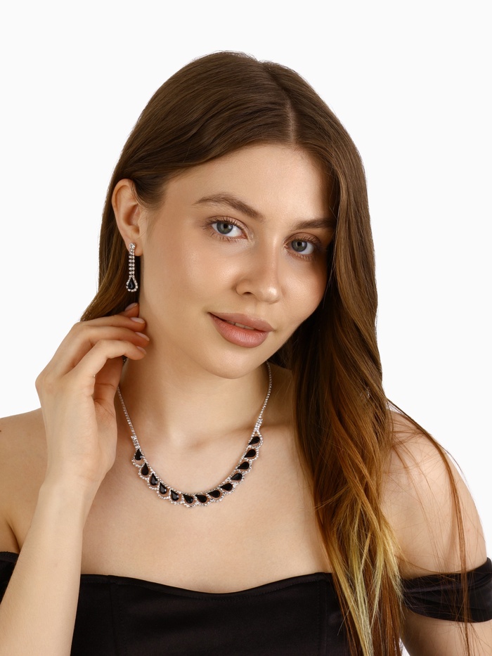 Набор из двух предметов: серьги и колье со стразами — это элегантный аксессуар с уникальным дизайном, который добавит сияния вашему образу. Этот комплект идеально подойдет для любого мероприятия, подчеркивая утонченность и стиль. Серьги и колье можно носить вместе или раздельно, дополняя образы для любого случая.