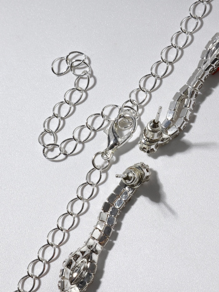 Набор из двух предметов: серьги и колье со стразами — это элегантный аксессуар с уникальным дизайном, который добавит сияния вашему образу. Этот комплект идеально подойдет для любого мероприятия, подчеркивая утонченность и стиль. Серьги и колье можно носить вместе или раздельно, дополняя образы для любого случая.