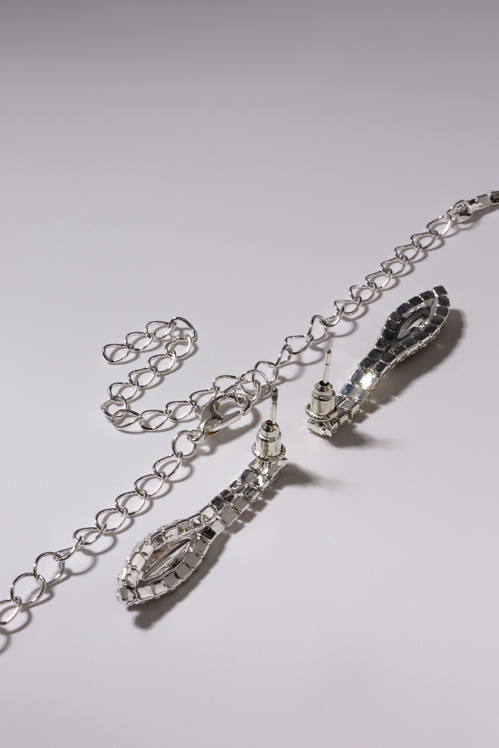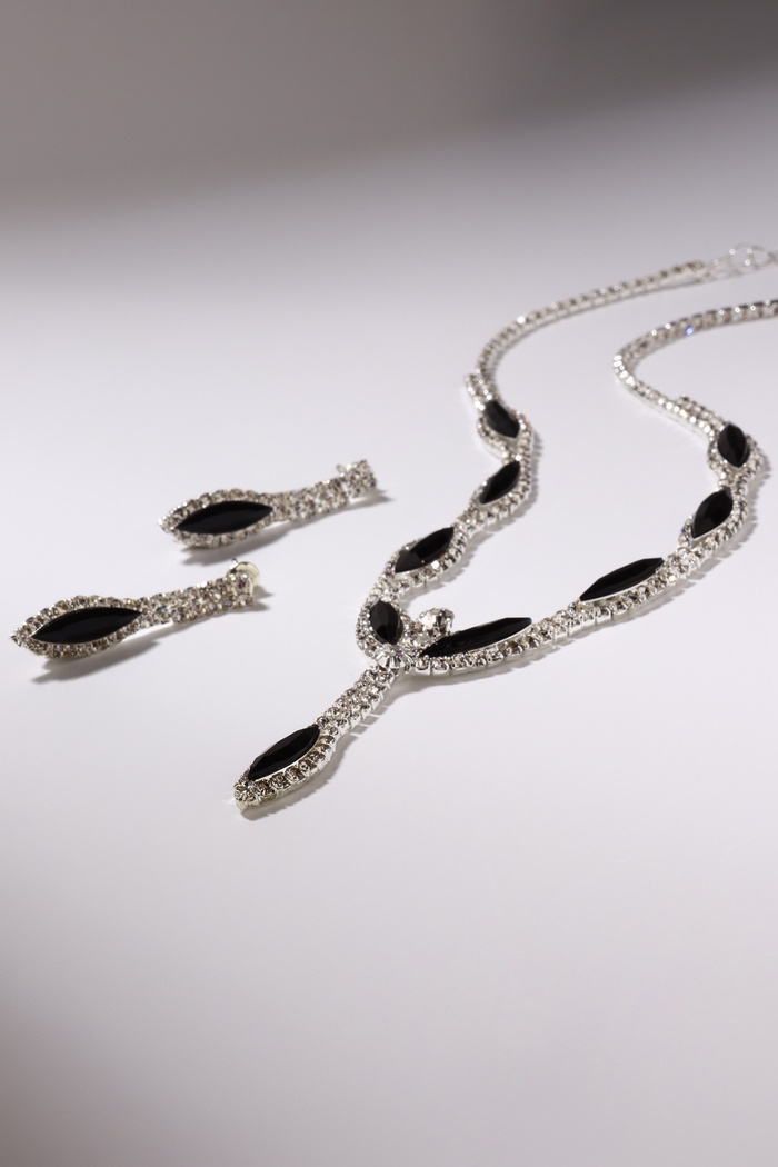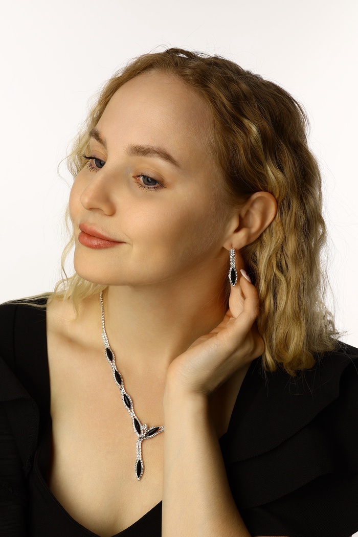 Набор из двух предметов: серьги и колье со стразами — это элегантный аксессуар с уникальным дизайном, который добавит сияния вашему образу. Этот комплект идеально подойдет для любого мероприятия, подчеркивая утонченность и стиль. Серьги и колье можно носить вместе или раздельно, дополняя образы для любого случая.