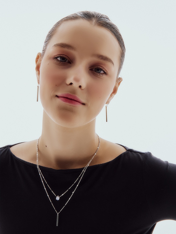 - Комплектация двумя предметами разного формата (серёжки и колье длиной 45 и 55 см) помогает завершить образ грамотно и стильно;
