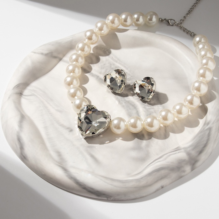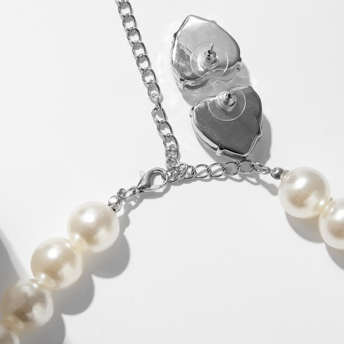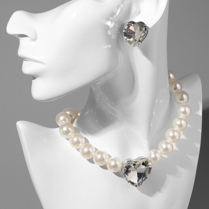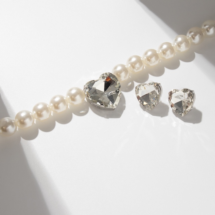 Набор 2 предмета; серьги, колье «Сердце» крупный жемчуг, цвет белый в серебре — Характеристики