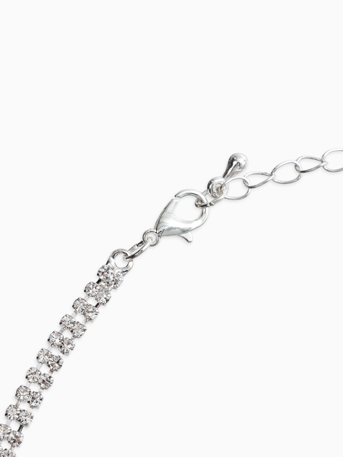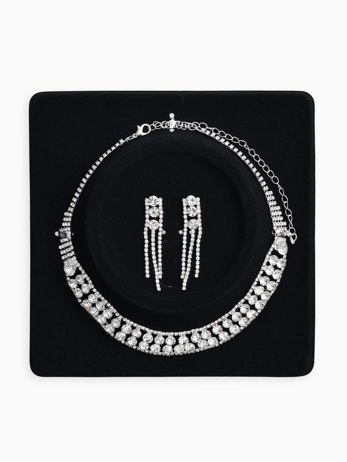 - Щедрое применение: Обилие страз на колье и серьгах эффективно привлекает внимание, подчеркивая шею и зону декольте, мгновенно привлекая интерес собеседников.